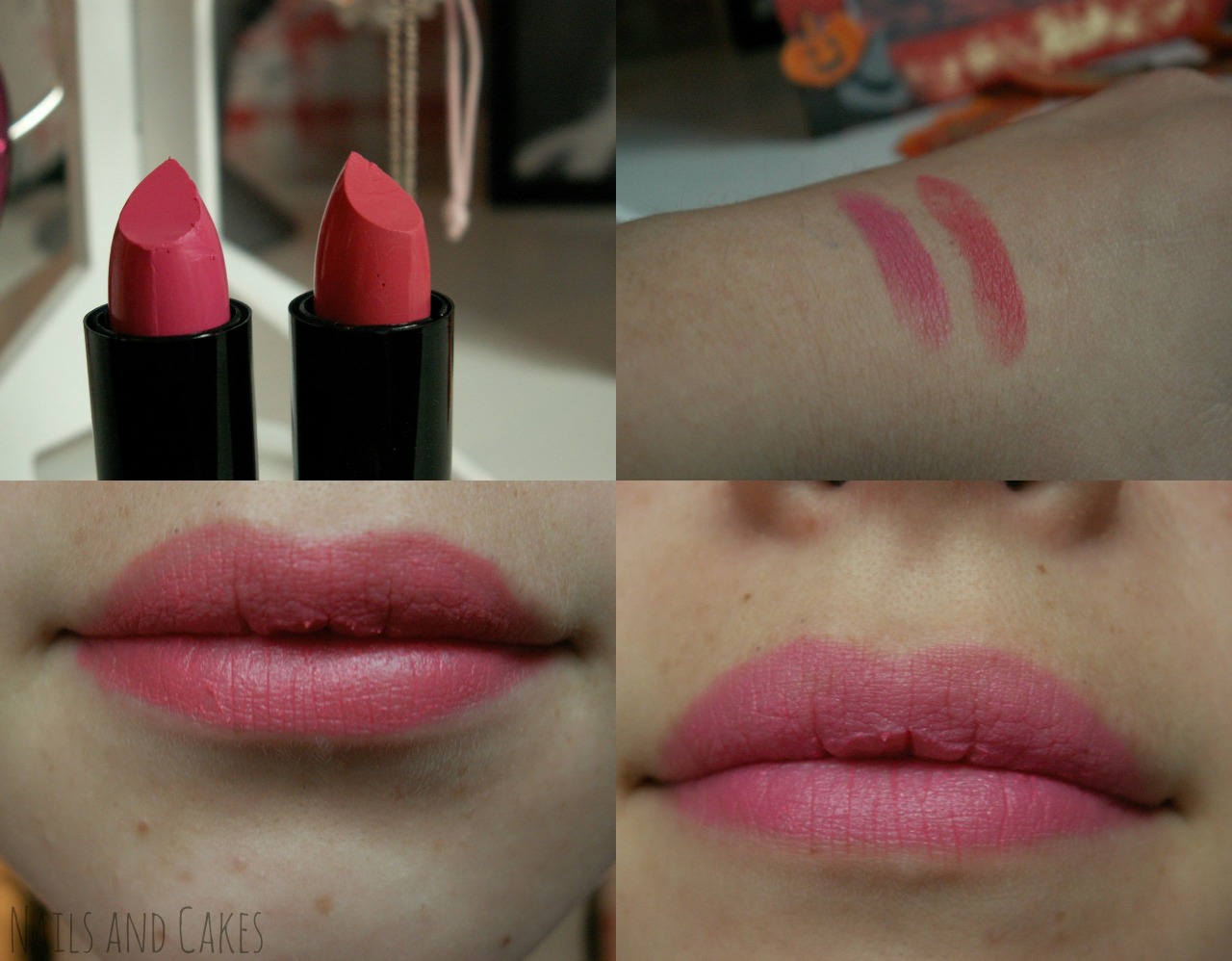 Candy Floss is een soort koraal-achtige kleur en Pretty Pink is een felle roze kleur. Op de swatches dekken ze niet echt slecht, maar ook niet super. Beide kleuren laten nogal de velletjes zien en ze verdelen niet helemaal mooi. Maar ja, wat wil je dan ook verwachten voor dit geld? Ik ben zeker niet teleurgesteld, want het zijn twee hele mooie lipsticks voor bijna niets. (De linkse lip-swatch is Candy Floss en de rechtse is Pretty Pink. Bij de bovenste twee foto's is dit andersom)